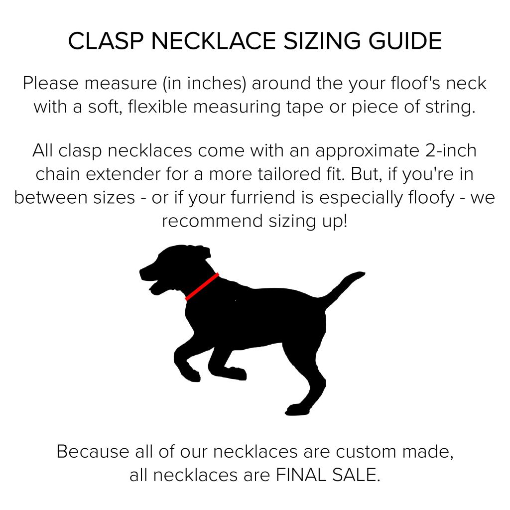 Since all of our necklaces are custom made, all necklaces are FINAL SALE. To ensure the best fit, please see our sizing guides below and remember to measure twice, order once! If you have any questions about sizing, please don’t hesitate to contact us.